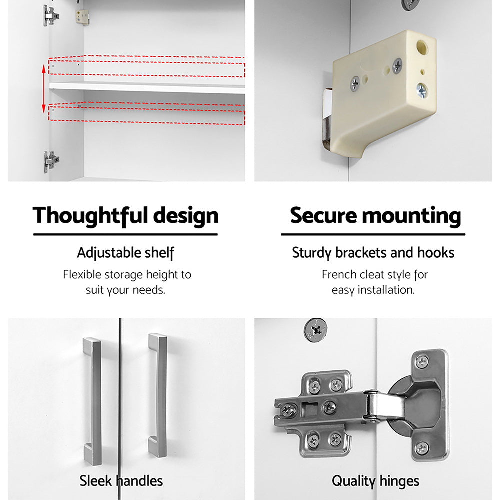 Tired of a messy home? Running out of storage space? Thankfully, you can start to declutter and organise your home beautifully with our sleek Cefito Wall Cabinet. Featuring an E1 engineered wood construction that is eco-friendly and non-irritating, our wall cabinet is a two-shelf cupboard with adjustable middle shelf to accommodate contents of various sizes. You will find quality hinges and sleek sturdy handles for hassle-free opening and closing, and smooth round edges for safe use. More importantly, the cabinet has a French cleat style mounting system with sturdy brackets and hooks for easy installation. Not least, its contemporary design will match easily with any modern dΓ©cor as will its compact sizing. In fact, the wall cabinet is perfect for creating extra overhead space wherever it is needed: in your kitchen, bathroom, living room, bedroom, balcony, office and more. So start organising your home and your lifestyle with our simple and extremely functional wall cabinet.