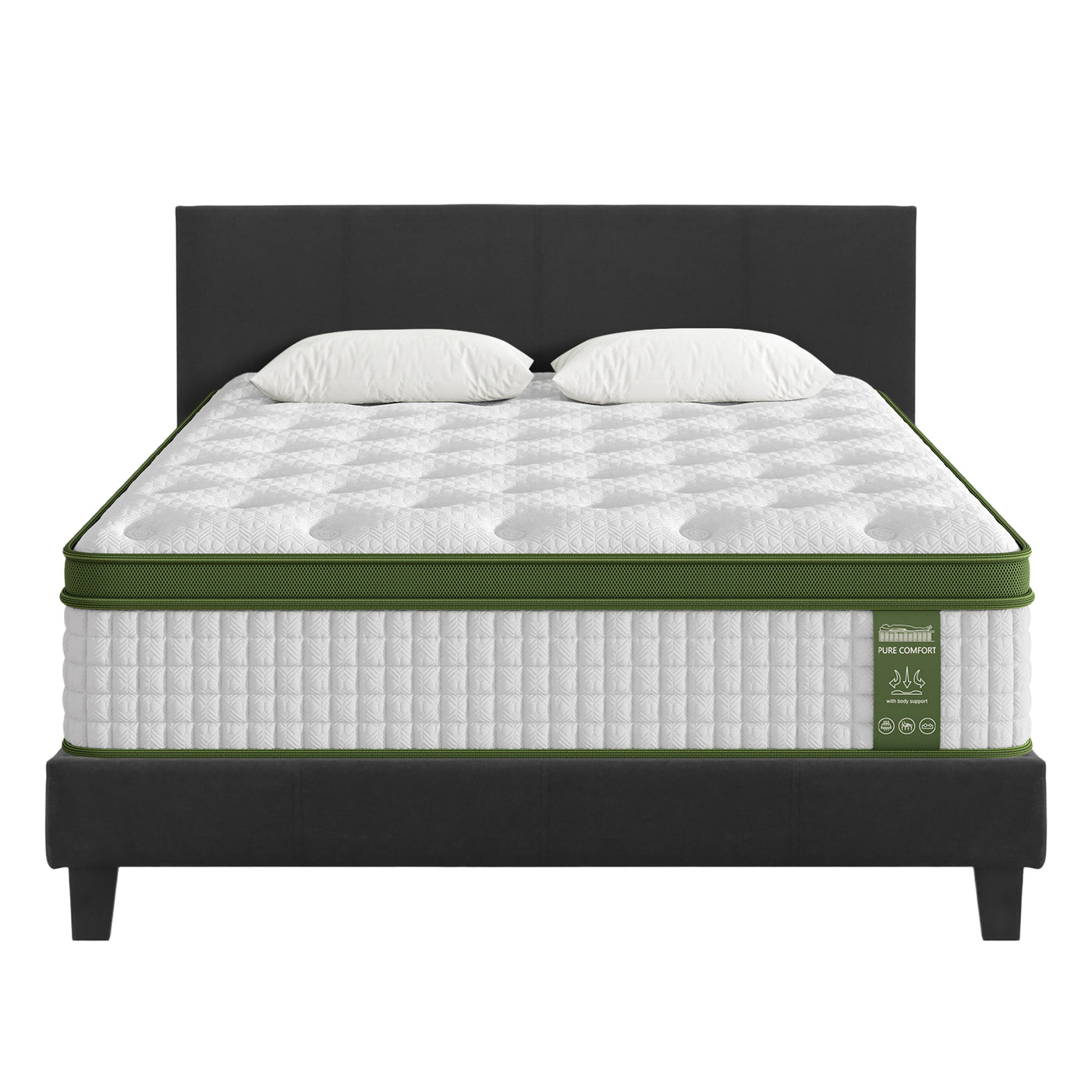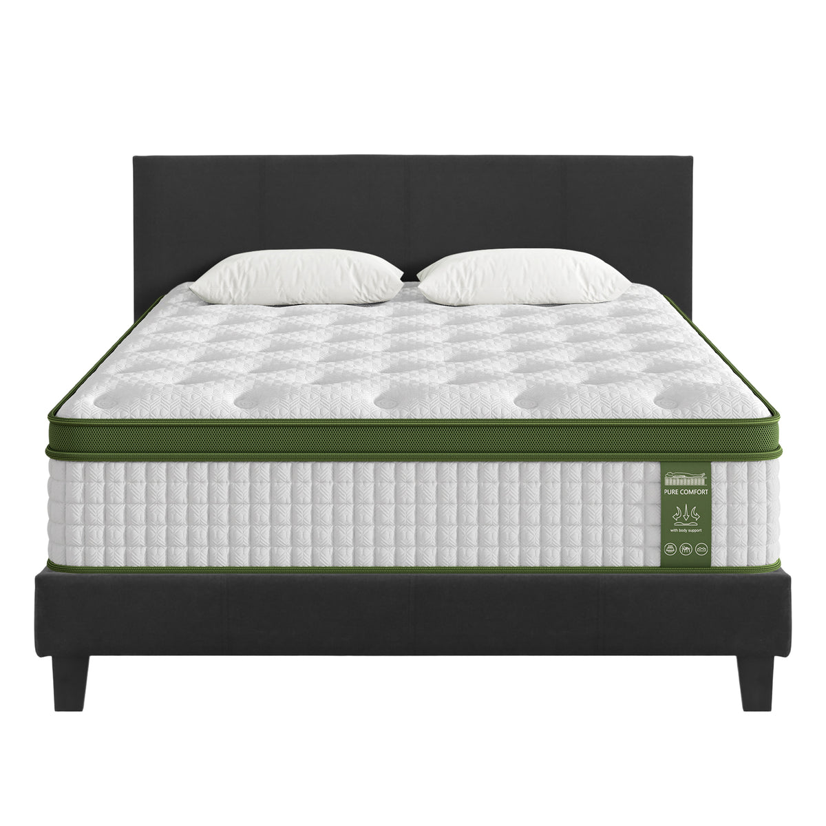 Complete your bedroom with this Artiss BedStory Double Set. The platform bed frame features a charcoal faux linen-upholstered headboard, solid wood frame, and arched slats for mattress ventilation. Paired with a hybrid pocket coil mattress offering medium-firm support with motion isolation. Easy assembly. Fits standard Double mattresses (190x138cm). Mattresses Backed by a 10-year support service