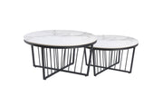 The Salina Coffee Table in Black is a sleek and modern table that can be used as a coffee table. The table features a metal black frame and is available with a white marble top. The coffee table comes in a large size measuring 90cm x 90cm x 41cm . The table is made from metal frame, white porcelain top, with each marble top finish varying in vein pattern and base colour, making each piece unique.